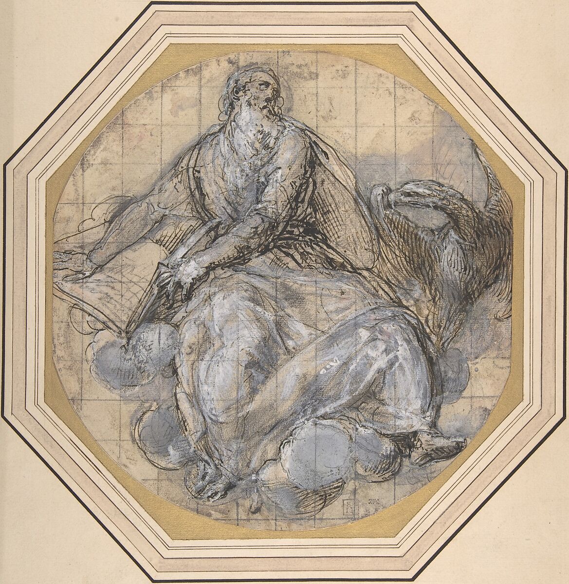 An eighteenth-century English inscription on the back of the old mount correctly identifies this drawing as a study for one of Giovanni de' Vecchi's most important commissions, the cartoons for two of the mosaic pendentives under dome in Saint Peter's. As recorded in 1642 by the biographer Giovanni Baglione ("Nella gran Basilica Vaticana il cartoni delli due Vangelisti di musaico Giovanni, e Luca sono forme magnifiche del suo ingegno") cartoons for the figures of Saint John the Evangelist and Saint Luke in colossal medallions were supplied by de' Vecchi, while those for the figures of Saint Matthew and Saint Mark were designed by Cesare Nebbia. De' Vecchi and Nebbia prepared the cartoons between 1598 and 1599, and actual work on the mosaics began in late 1599 and continued through early 1601. Vibrantly drawn in pen and brown ink over black chalk, and extensively highlighted with white gouache, Giovanni de' Vecchi's study corresponds fairly closely to the mosaic in St. Peter's, though in the latter the Evangelist looks down rather than gazing to upper right.