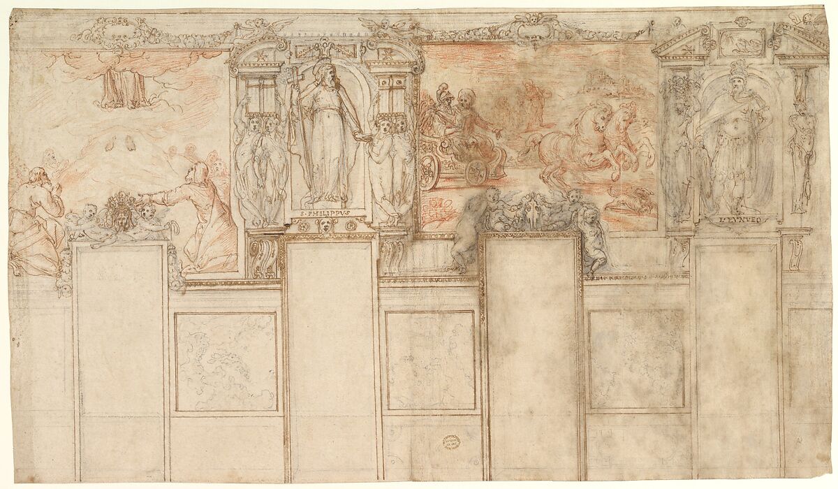 In the scene at left Christ ascends into a bank of clouds, having left his footprints on the summit of the Mount of Olives. At right of center Saint Philip has joined the Eunuch in his chariot and explains the passage of Isaiah the Ethiopian is reading, while in the background Saint Philip is seen baptizing his convert (Acts 8:26-40). The "bretessed bend" and the stars of the Aldobrandini arms that appear above the figure of Saint Philip could identify this project as a never-executed scheme commissioned by or proposed to Pope Clement VIII Aldobrandini, who reigned from 1592 to 1605. The convincing attribution to Giovanni de' Vecchi for this large, vibrant design for a wall decoration was first proposed by Philip Pouncey in 1965.