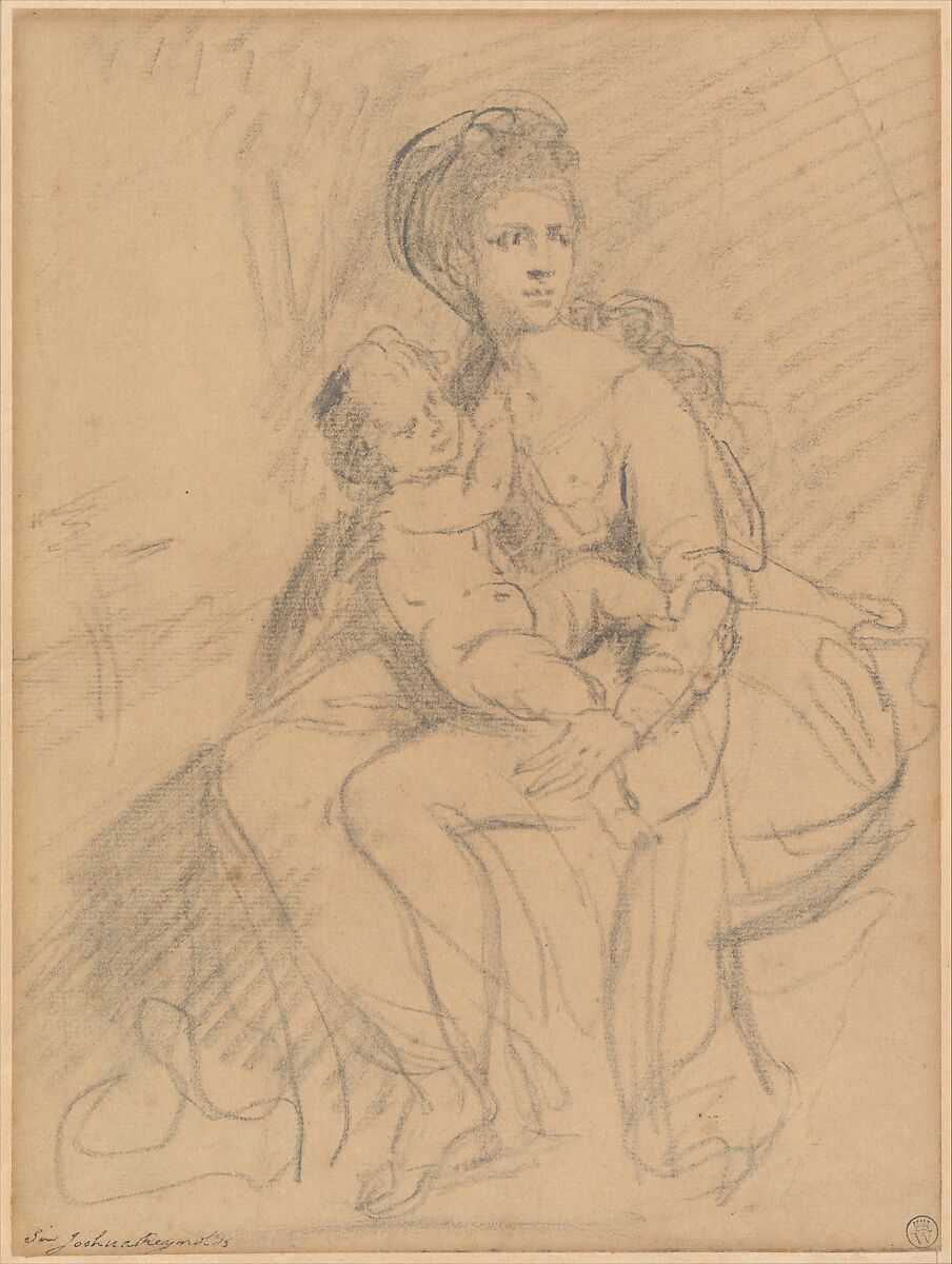 The woman's seated pose is remarkably dynamic: as she turns to gaze over her shoulder, curls tumble from her coiffure, and folds of drapery spill across her lap, revealing slender legs crossed at the ankles. By contrast to the careful articulation of her face, her fingers are only schematically indicated, while the contours of the child's naked body are succinctly described in short strokes of black chalk. This rare compositional study by Sir Joshua Reynolds--the leading British portrait painter of the eighteenth century, first president of the Royal Academy, an influential theoretician of art, and a distinguished collector--is not related to any known painting. But its allusion to the Madonna and Child, and severely classicizing, Michelangelesque style link it to the artist's most accomplished grand-manner portraits of the 1770s.
