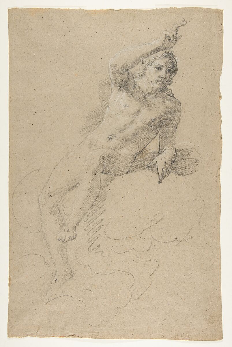 - Medium: Black chalk, highlighted with white, on grayish brown paper (recto); faint black chalk study of the same figure and three studies for a left hand (verso)