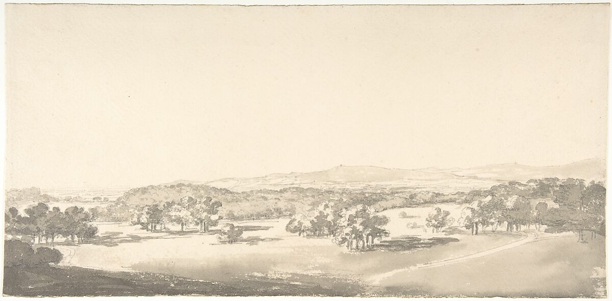 Traditionally, this drawing has been called a view Derbyshire, a county that Constable visited in 1801. An inscription on the back of the sheet links the view to Lowther Castle, Westmorland, in 1815, although this later date seems unlikely–since the artist's style had changed significantly by that date. In its compositional structure and the handling, the drawing resembles a watercolor view of the Thames from Windsor Castle (now Rhode Island School of Design) made by Constable in 1802. Sensitively applied wash alternates darks with lights to describe trees growlng along rolling hills and to indicate recession. An interst in simplified landscape forms suggests an awareness of the work of a near contemporary Thomas Girtin.