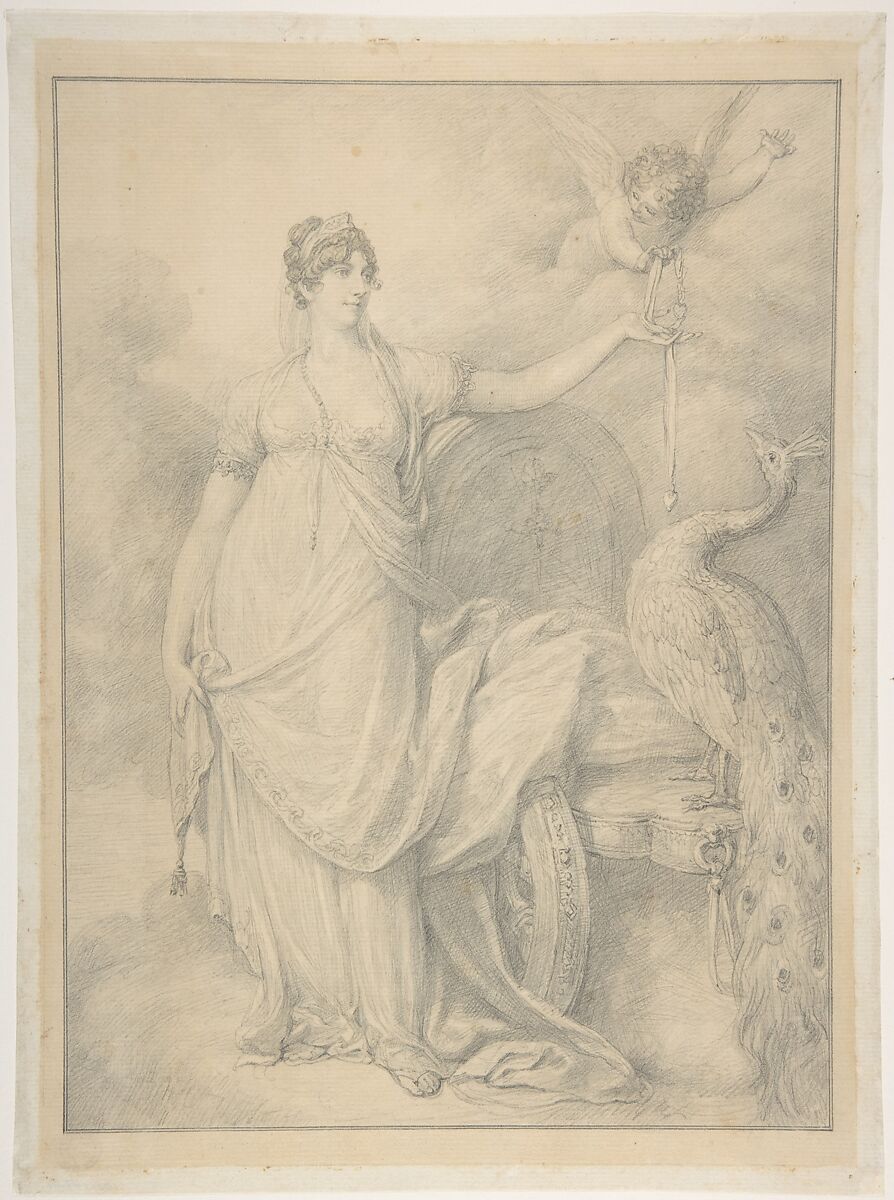 Cosway here compliments Lavinia Spencer by awarding her the attributes of Juno, including a tiara and peacock. Love is evoked by Cupid who delivers a heart dangling from a ribbon. The daughter of Charles Bingham, 1st Earl of Lucan, the sitter's beauty and intelligence attracted George Spencer, Viscount Althorp and, though she lacked a suitable dowry, the marriage was approved by the groom's parents. Cupid's presence refers to that love match, while the evocation of Juno, protectress of childbirth and domesticity, refers to the couple's twenty-seven year marriage and nine children.