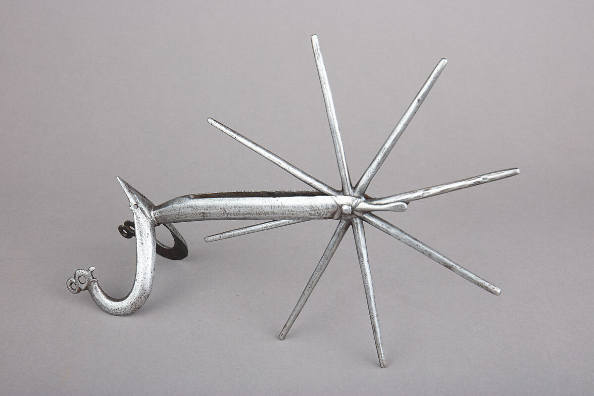 This type of spur, with its large and impressive rowel and its dragon's head terminals, was popular among Hungarians in the 16th century. Its general shape is an evolution of late medieval spurs. The proportions of the rowel, rather impractical, mostly served the purpose of showing off the high social status of the rider.
