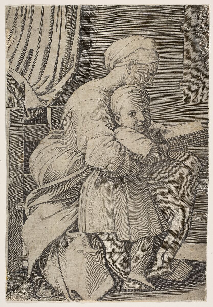 - Title: The Virgin in profile facing right reading to the infant Christ