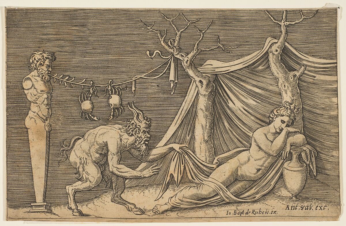 - Title: A satyr discovering a sleeping woman; two crabs hanging from a rope which is strung between a term and a tree