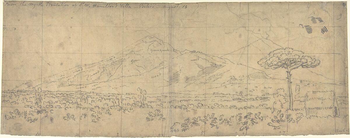 Cozens visited Italy for the second time in 1782-83, leaving England in May with the wealthy patron William Beckford, reaching Rome by early July, then continuing on to Naples to stay with the British consul Sir William Hamilton. The death of their host's wife shortly afterward prompted Beckford to move on to Switzerland, but Cozens remained in Naples to recover from a lingering fever. An inscription on this outline drawing of Vesuvius indicates that the view was made at Hamilton's villa at Portici on August 18, 1782.