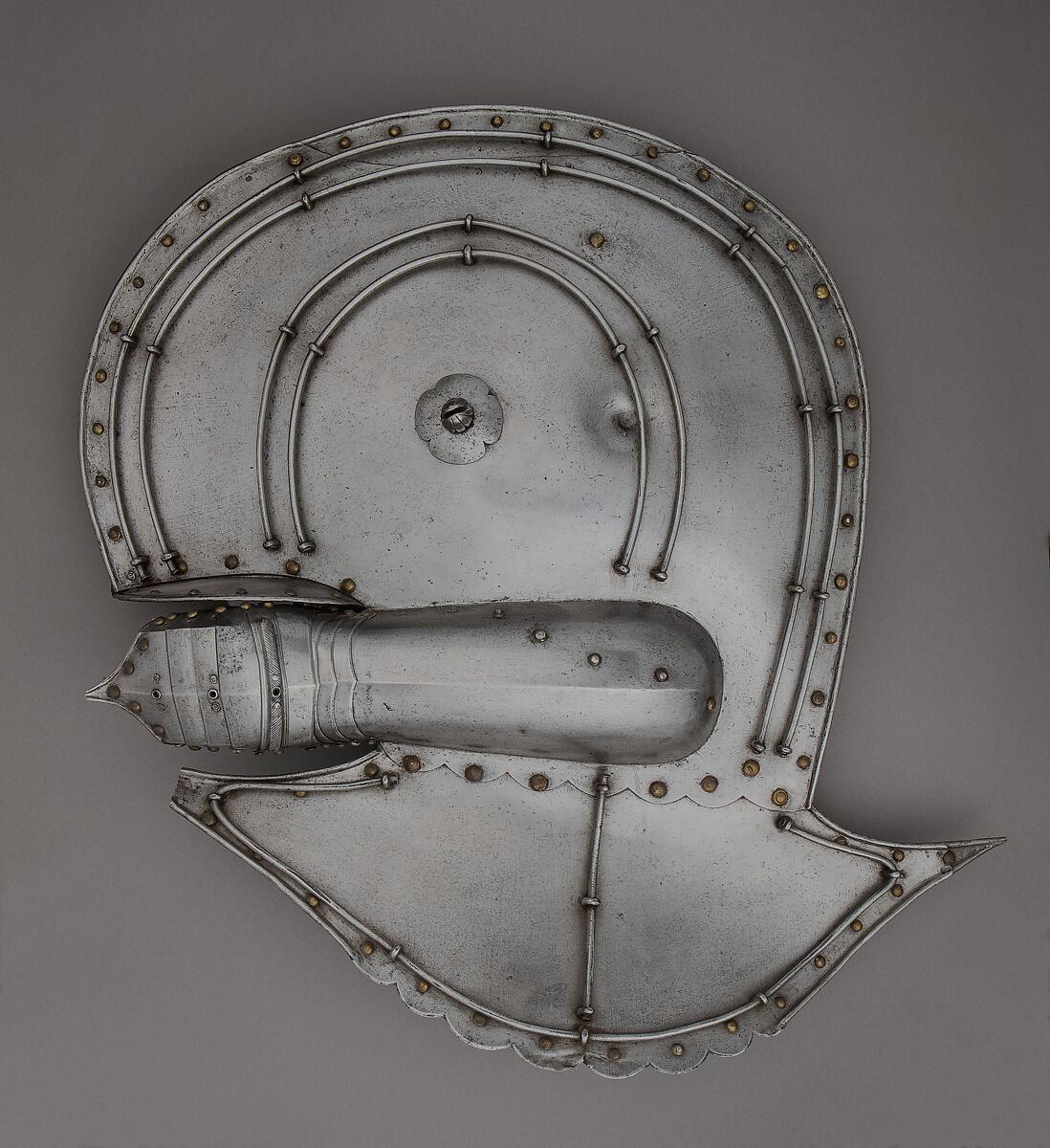 This unusual shield features a gauntlet-like element built directly into its body, which covered the user's arm and supported the weight. The raised bars could catch an opponent's sword point. Some similar examples feature attached sword blades. Seemingly impractical for fencing or defense, the large and irregularly shaped shield may have been intended more to present a novel and fearsome appearance than to protect the wearer.