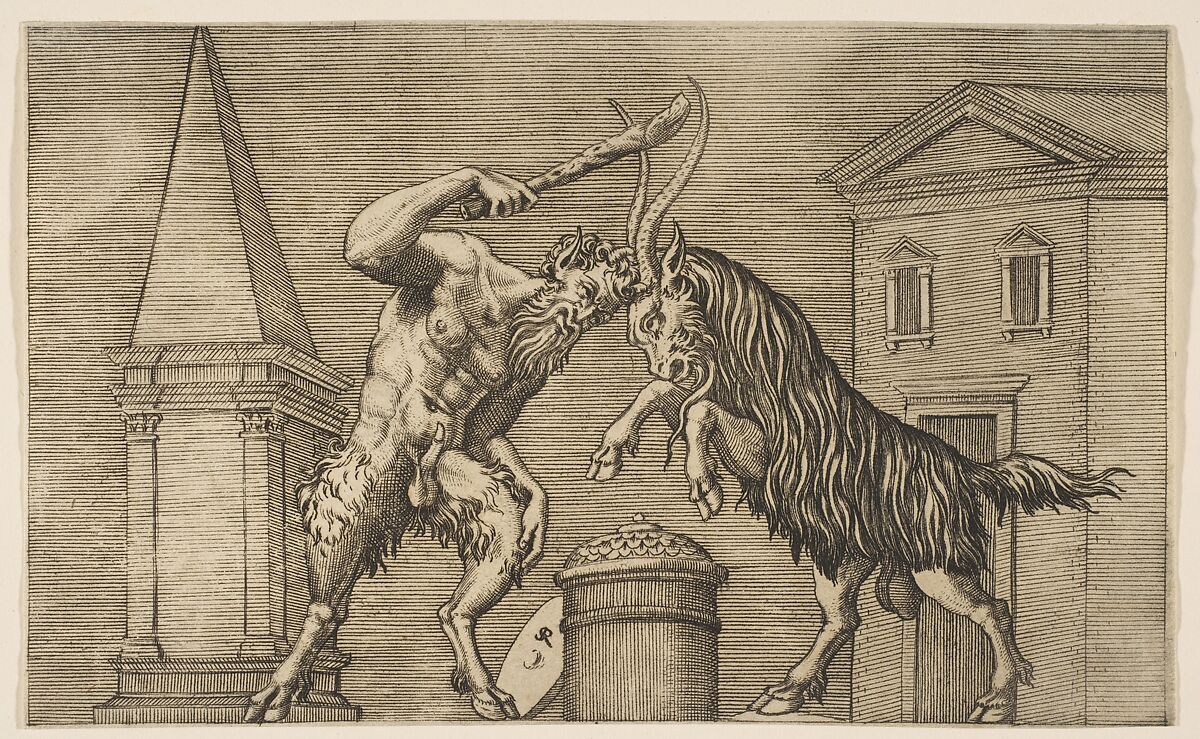 A satyr and a ram attacking each other, the satyr weilding a club with his right hand, a shield resting against a small column at center, buildings in the background