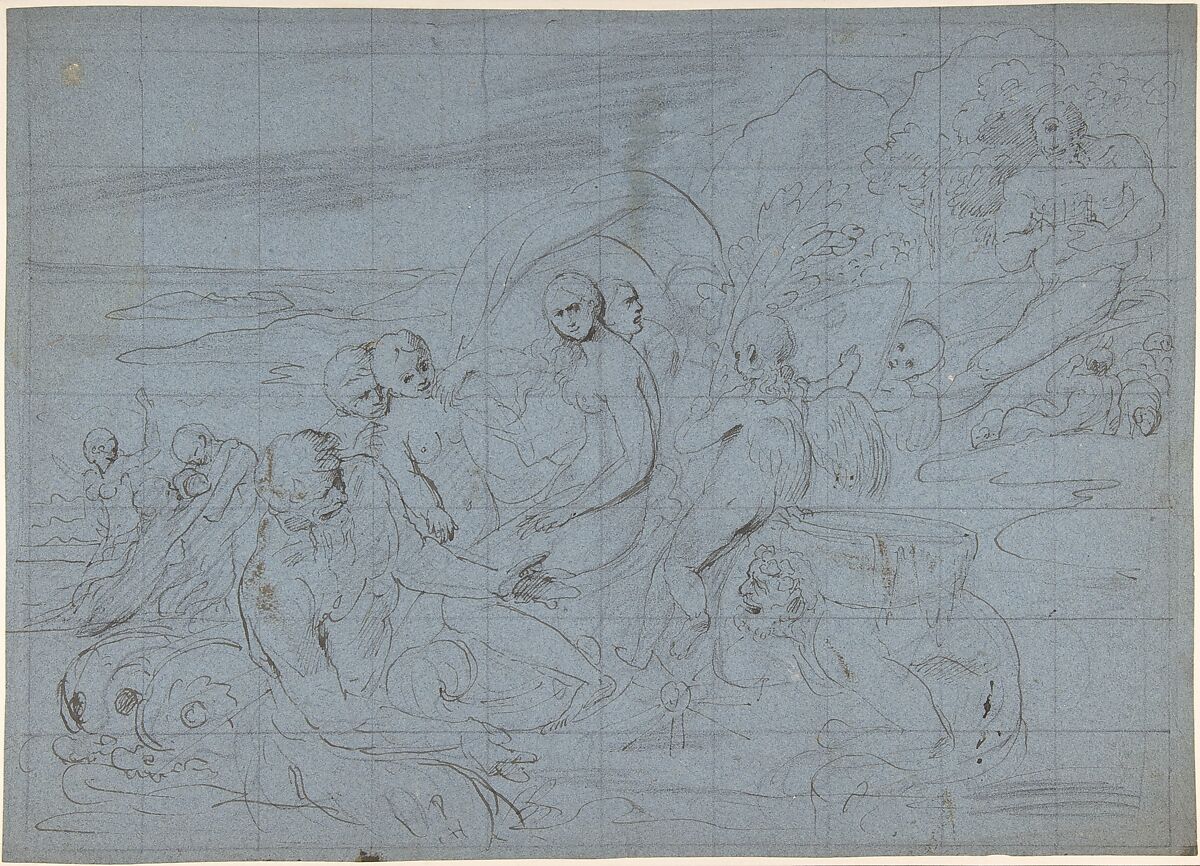 - Medium: Pen and brown ink, over black chalk, on blue paper. Squared in black chalk