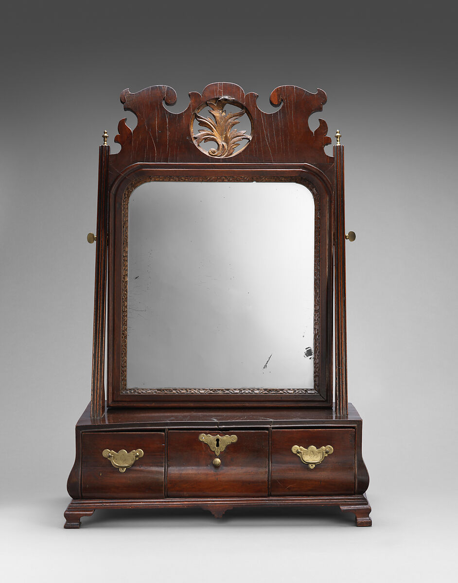 Like their European counterparts, aspiring American colonists were intensely focused on their appearance, and adorned themselves in imported textiles, millinery, jewelry, footwear, and cosmetics. This interest in personal image led to the development of specialized furniture to assist in the rituals of self-fashioning. Dressing boxes with looking glasses—particularly with the bombé or swelled base like you see here—were common in England, but rarely made in North America before 1800. The bold scalloping of the frame’s crest and the dancing, flame-like appearance of the carved, gilded leafage at the center reveal the rococo taste popular at the time.