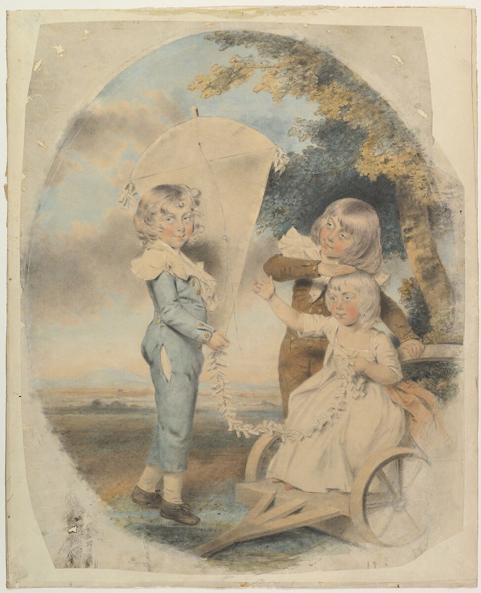 Downman here portrays a baby in a wheeled cart tugging at a kite held by one of two older boys. These are probably the children of Jeremiah Dyson (1757-1835), clerk of the House of Commons, who married Elizabeth Collins in 1781. Their grandfather, Jeremiah Dyson (1722-1776), was Lord of the Treasury and Privy Counsellor to George III, and old labels on the back of the frame that once contained this drawing identify the sitters as his children. This could not be possible if the drawing dates to 1787, because Jeremiah senior died in 1776 and his wife in 1769, while the oldest child here appears to be under six years old.