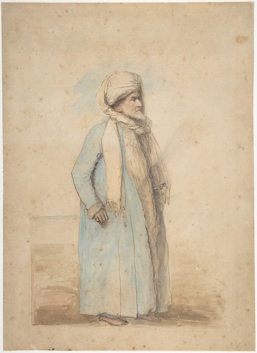 This delicate watercolor of an elderly Arab, which may represent the Tunisian ambassador to the British Court of St. James's, was made about 1780 by Humphrey, a portrait painter and miniaturist. He devoted his attention to the assertive profile and turbaned head of the sitter, rendering the robes and setting more broadly with rapid pen strokes and pale blue, pink, brown, and gray washes.
