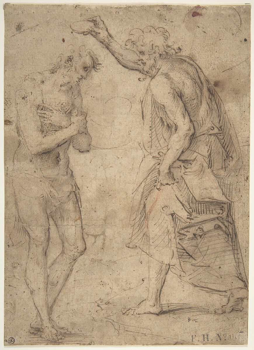 The drawing exhibits a sufficiently expressive quality of mark, rapidity of outlines and hatching, to suggest it is an autograph work by Moncalvo. Previous proposed attributions have been to the circle of Moncalvo (notes on the mount by Timothy Clifford, Mario di Giampaolo, Sylvie Béguin, endorsed by Carmen C. Bambach). Antonella Chiodo (oral communication on July 22, 2014) has connected the drawing to a fresco of a Baptism attributed to the workshop of Moncalvo in the parish church of San Salvatore Monferrato, province of Alessandria.