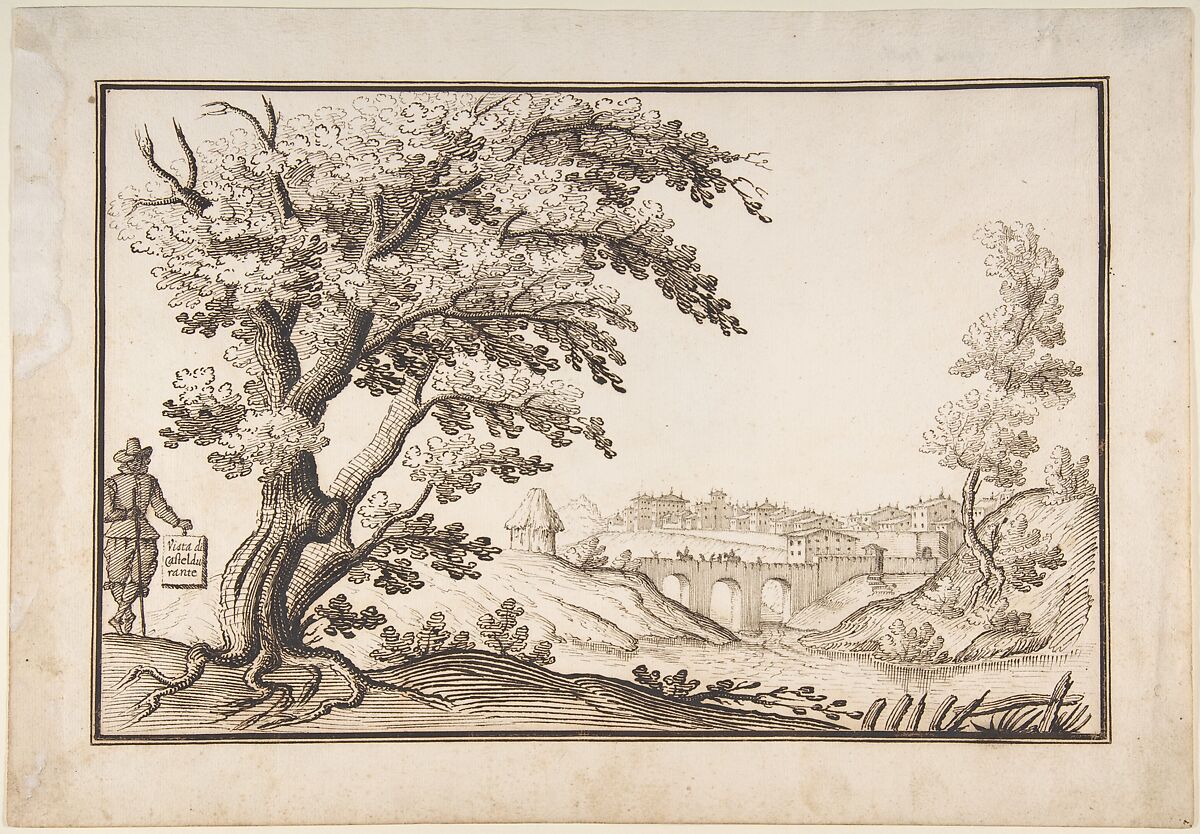 - Title: Framed Landscape with a View of Castel Durante with a Figure Holding an Inscribed Plaque in the Foreground