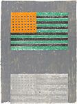 A key figure in what was termed the Neo-Dada movement, Johns appropriated common, often overlooked, objects such as ale cans, flags, maps, and stenciled letters and numbers (all things that, the artist claimed "the mind already knows") in his work. His banal subjects can be seen as evoking Marcel Duchamp’s concept of the readymade, yet whereas Duchamp selected an ordinary object such as a urinal or bicycle wheel, removed it from its expected location and function, and placed it in the context of "art," Johns instead creates representations of such objects in paintings, drawings, sculpture, and prints, each of which makes evident its construction, materials, and the artist's touch. Rather than prioritizing the originality of each composition, Johns focuses on methods of representation and translation between mediums and contexts; as he famously wrote in a notebook in 1963–64 about his intent to "Take an object. / Do something to it/ Do something else to it." Here, Johns used lithography to render two American flags on a single sheet of handmade paper: one, brightly colored and firmly anchored in the upper register, the other, a ghostly twin rendered in tones of grey and only partially visible, appears to nearly slide off the sheet.