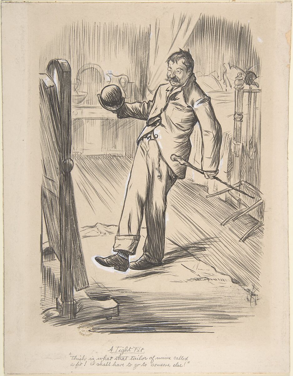 A tipsy man who has buttoned his jacket crookedly is puzzled by his reflection in a long mirror. Keene's design was intended to be reproduced as a wood-engraving, probably in Punch, the popular periodical with which he was associated between 1864 and 1890. A leading British illustrator, Keene generally focused on humorous situations in humble surroundings, while his contemporary George Du Maurier satirized London society.