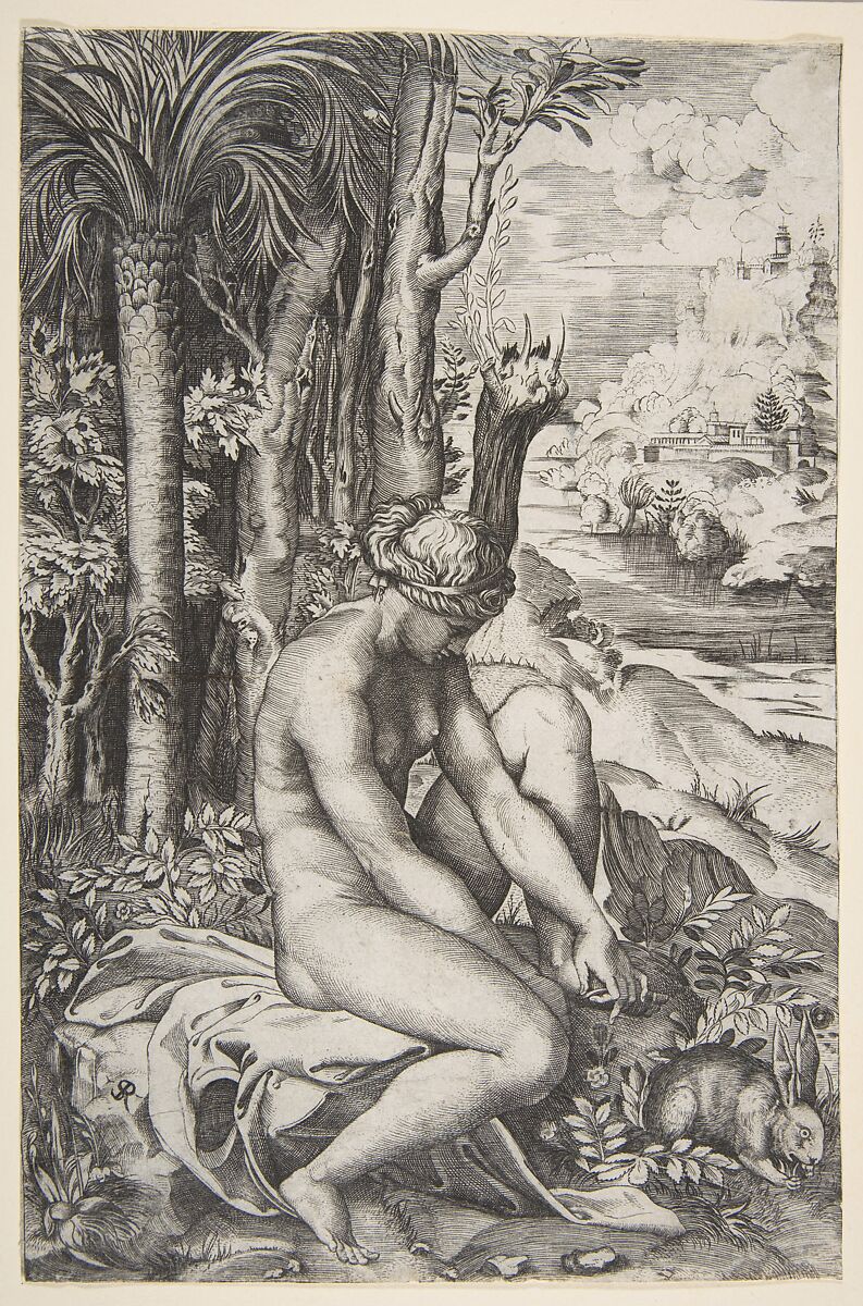This print depicts one of the compositions Raphael designed for the stufetta (bathroom) of Cardinal Bibbiena in the Vatican. The small room was richly ornamented all’antica, with grotesques and scenes representing Venus. Dente’s engraving relates to a fresco that no longer survives. Venus is shown removing a thorn from her foot, which, according to legend, caused blood to drip onto a white rose, coloring the flower red. The engraving’s rich and varied landscape, which was not part of Raphael’s original design, relies heavily on the rendering of nature in Albrecht Dürer’s engravings.