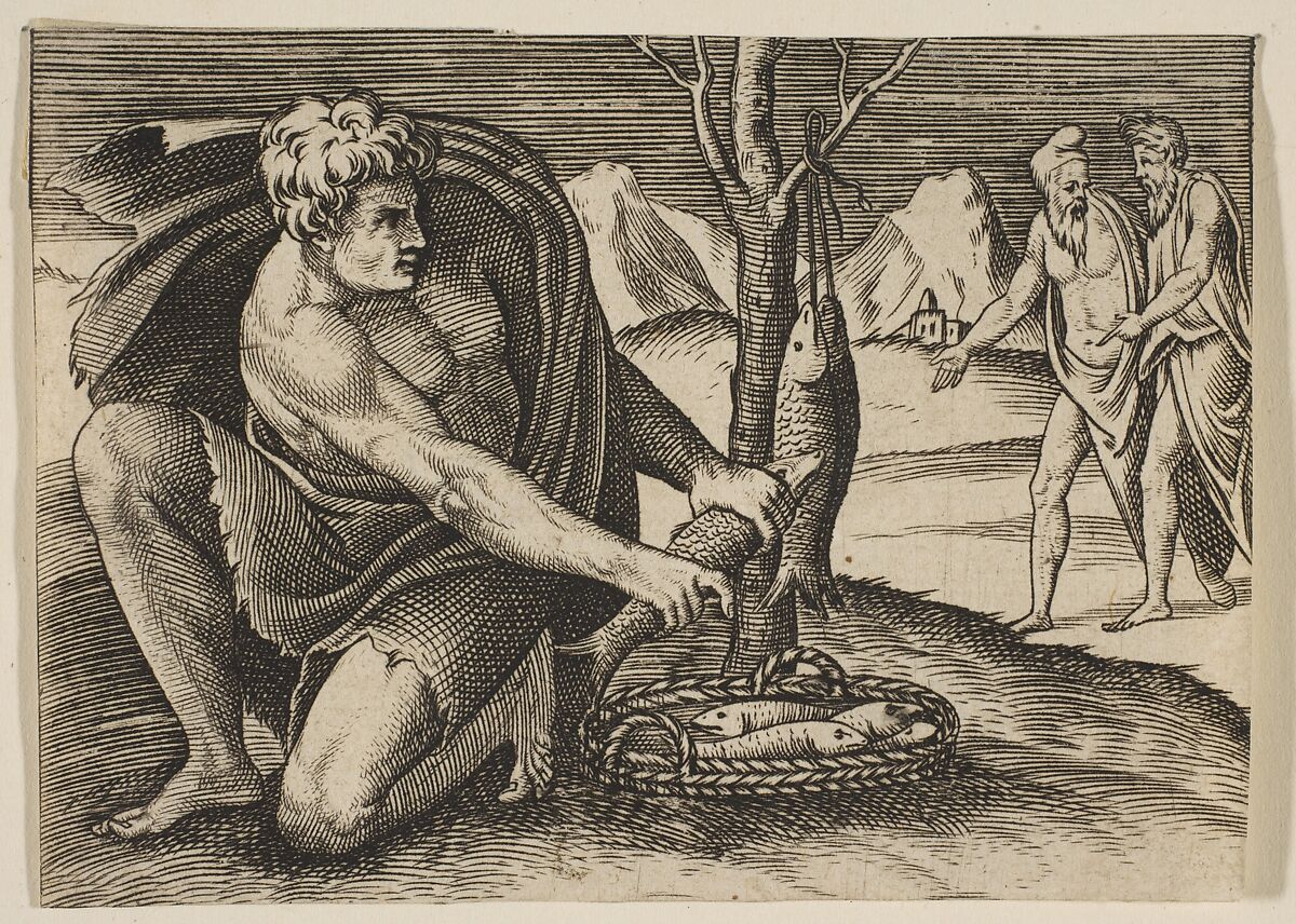 - Title: A man kneeling next to a basket of fish and taking one with both hands, two men at right in the background