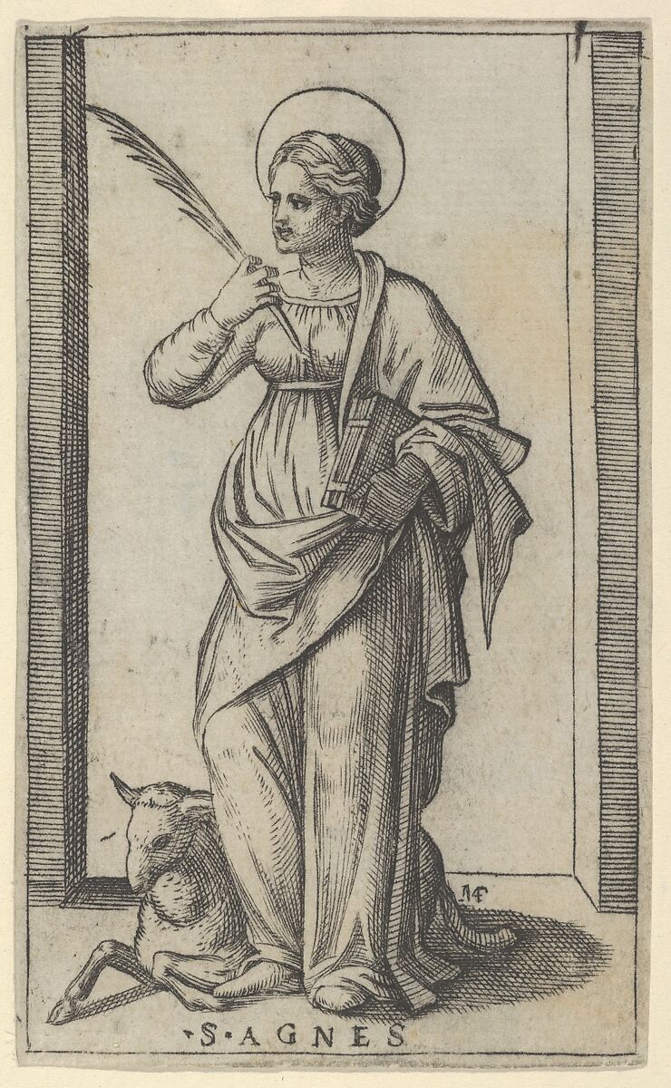 - Title: Saint Agnes standing a holding a palm in her right hand, a sheep lower left, from "Piccoli Santi" (Small Saints)