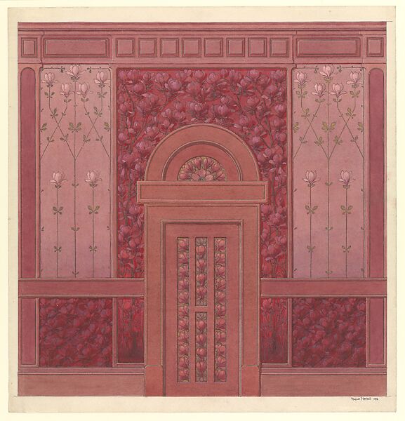 Auguste Herbst was a very versatile artist who is mainly known for his work in the firm of Emile Gallé (French, Nancy 1846–1904 Nancy). As one of his companions and chief designers, Herbst made designs for glass, ceramics and even marquetry, which were produced in Gallé’s workshops in Strasbourg and Nancy. After Gallé died in 1914, Herbst continued to design for the Gallé firm and numerous of his designs for glassware and ceramics are still kept in museum collections. This design for a room decorated with magnolias must have been one of his earlier works. While fitting in well with current developments in interior decoration, the room has a very distinct character. In his interior, Herbst combines a natural rendering of the magnolia tree, growing in an arch-shape around the door, and even throwing shadows on the pink background, with a more stylized pattern reminiscent of contemporary Arts & Crafts designs, seen in the pattern of the rose wall panels and across the ceiling.