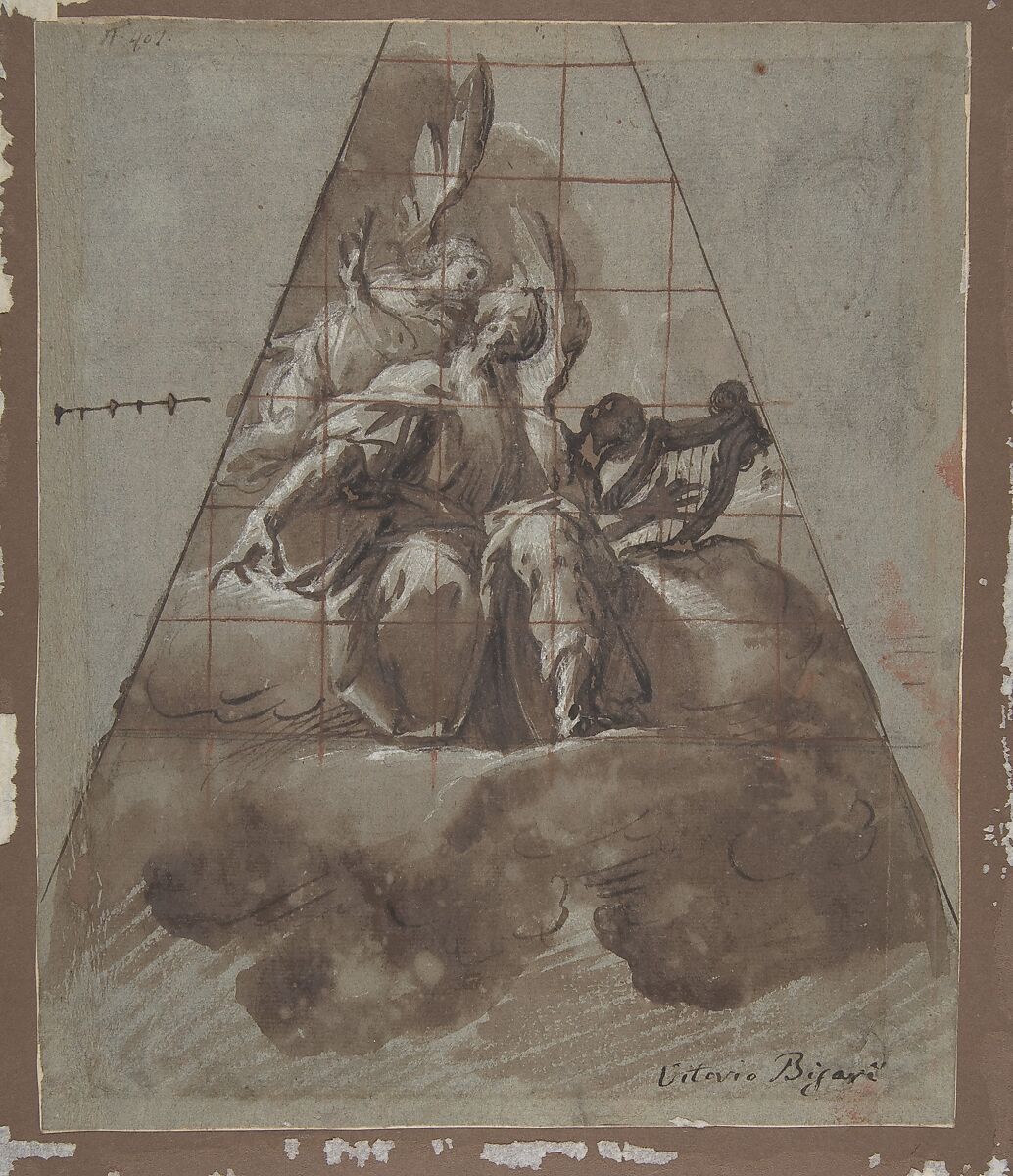 The monumental seated figure of David who points downward as he receives inspiration from an angel at upper left dominates this scene; in the right background the youthful figure of an angel can be discerned playing the harp. This relatively finished, squared demonstration drawing (‘modello’) was preparatory for a fresco on one of the spandrels supporting the dome of Piacenza Cathedral, painted by Morazzone in 1625-26, shortly before his death. The frescoes were left unfinished by Morazzone and the remaining compartments were finished by Guercino. Among the only differences between study and finished work, the drawing omits the monumental flying figure of the angel bearing a scroll who is seen immediately below the seated David in the fresco. Probably secured through the intervention of Bishop Giovanni Linati, the frescoes by Morazzone are mentioned by a number of seventeenth-century authors, which attests to the prestige and importance of the commission (Giovanni Baglione in 1642, p. 186; Scaramuccia in 1674, p. 164; Carlo Malvasia in 1678, II, p. 367; and Filippo Baldinucci in 1681-1728, IV, ed. 1846, p. 653).