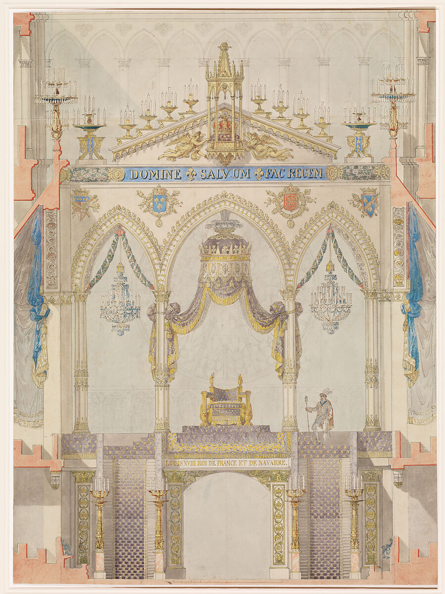 This sheet shows an elevation of part of the interior of Reims Cathedral with the rood screen and throne for the coronation of King Louis XVIII. This design represents one of six drawings that form the only documentation of the plans for the coronation of King Louis XVIII, which never took place. The event was likely delayed, and eventually dismissed due to the precarious state of the French monarchy and the declining health of the King. In addition, the idea of a Royal coronation, bestowed by the French Catholic Church had become a point of contention after the fall of the first monarchy and the Emperor Napoleon’s decision to crown himself. For these reasons, King Louis XVIII’s successor, Charles X, opted not to have a coronation in Reims when he ascended the throne in 1824. Some of the concerns for how the coronation would be perceived can be noted in the decoration scheme that was devised by Percier and Fontaine. The architect duo had also been the official designers for the coronation of Emperor Napoleon. To mark the distinction, in their designs for Reims Cathedral, they veered away from the vocabulary of the Empire Style, and instead worked in a style known as Palladian Gothic. In addition, they incorporated references to the historic legitimacy of the Bourbon dynasty throughout their decoration scheme.