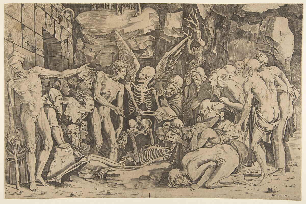 - Title: The Skeletons, a group of emaciated men and women gathered around a skeleton laid on the ground and a figure of Death as a winged skeleton standing above it holding an open book