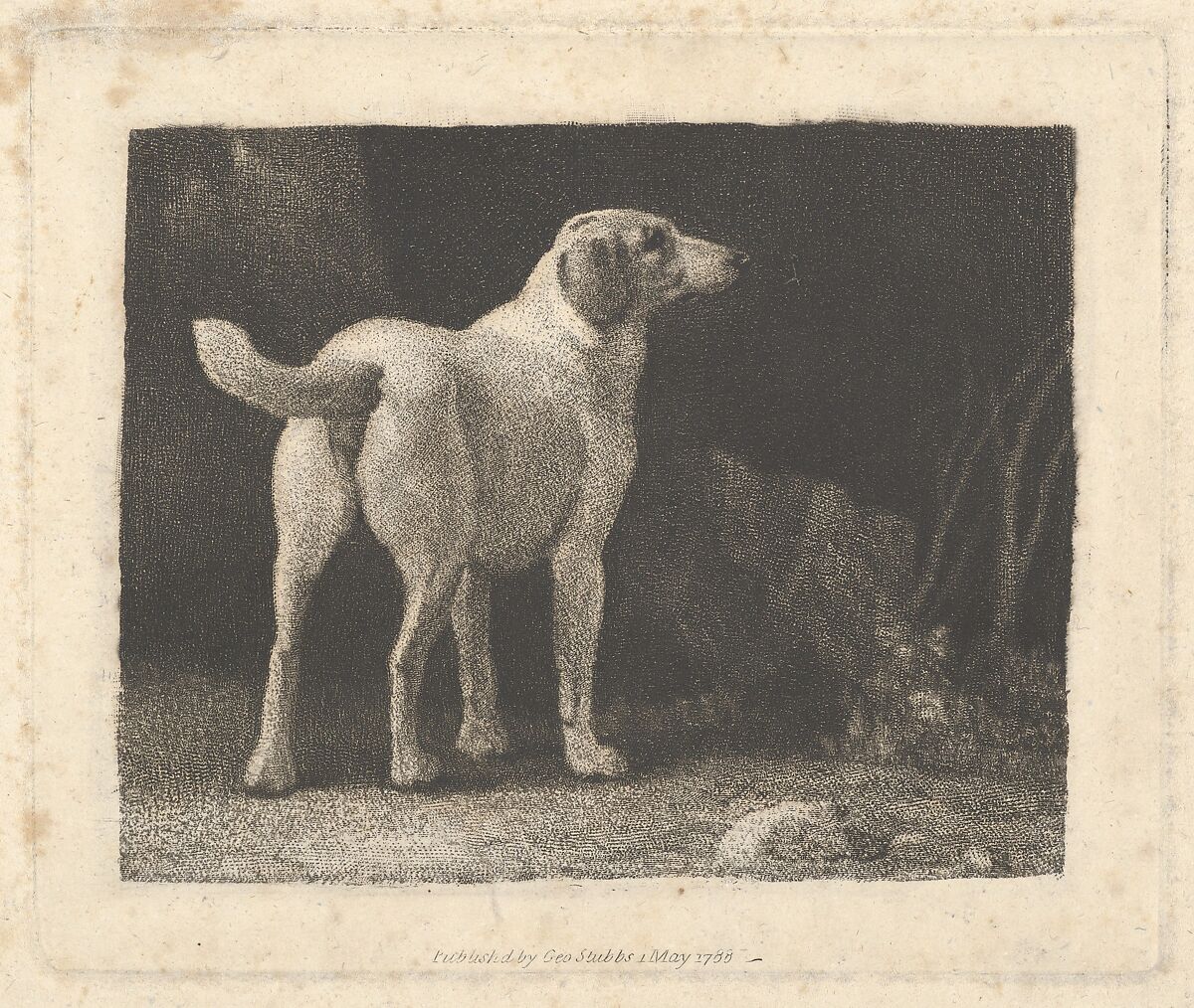 Stubbs was unusual among his contemporaries for both designing and etching this print himself. It is one of a series in which he experimentd with several methods at once. Here, most of the plate was executed in the relatively new technique of stipple engraving, with some mezzotint possibly added to produce the velvety darkness of the background. Against this shadowy setting the solid and carefully delineated form of the listening foxhound stands out in pronounced relief.