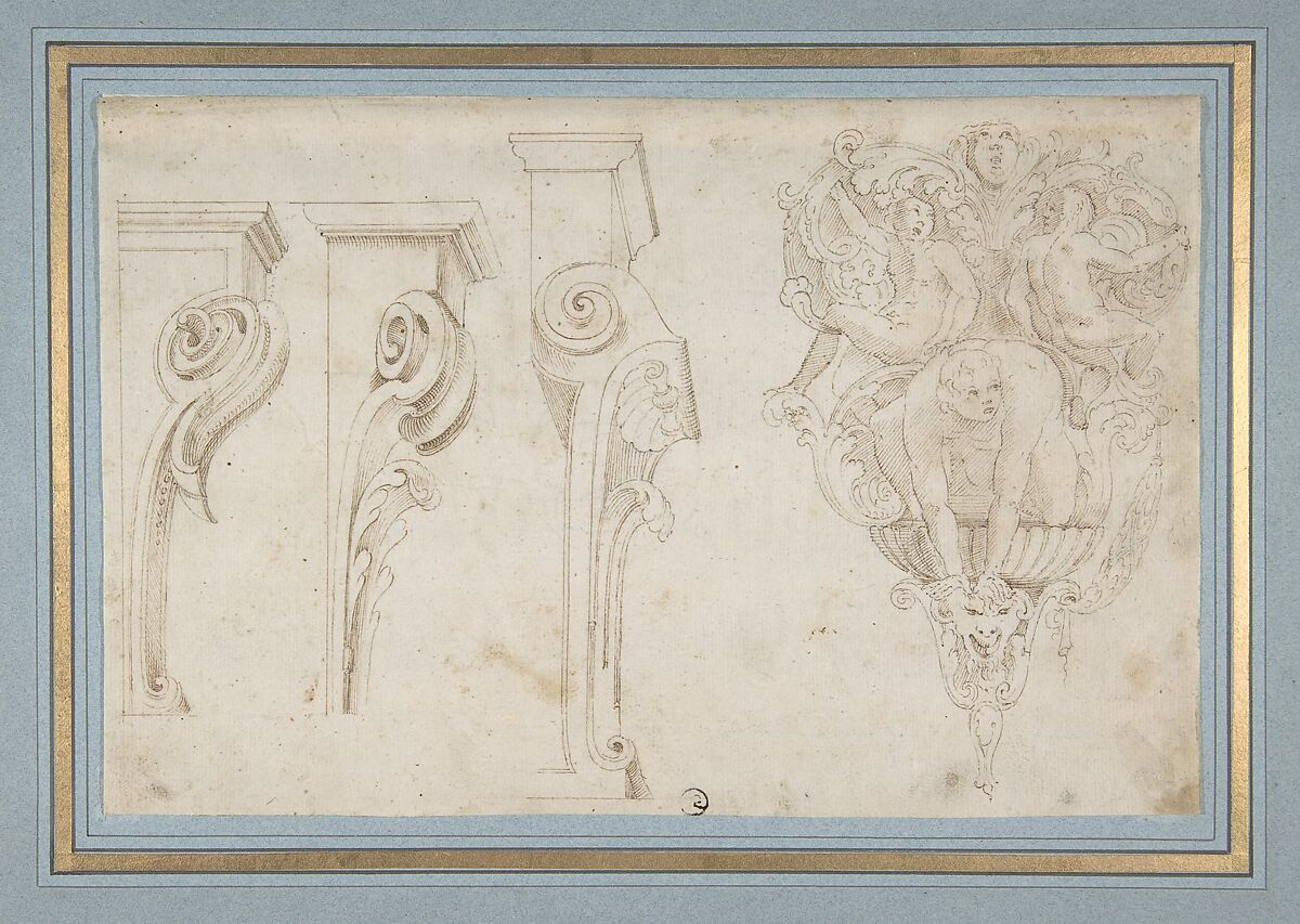 - Title: Design for Three Consoles Decorated with Foliage and Volutes and a Console with a Satyr Head Surmounted by Three Human Figures, Garland and Foliage