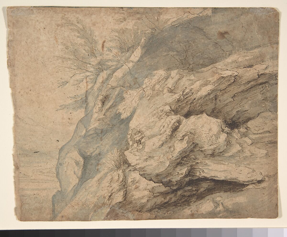 - Title: Study of the Side of a Rocky Cliff; Verso: Dam on a Mountain Stream