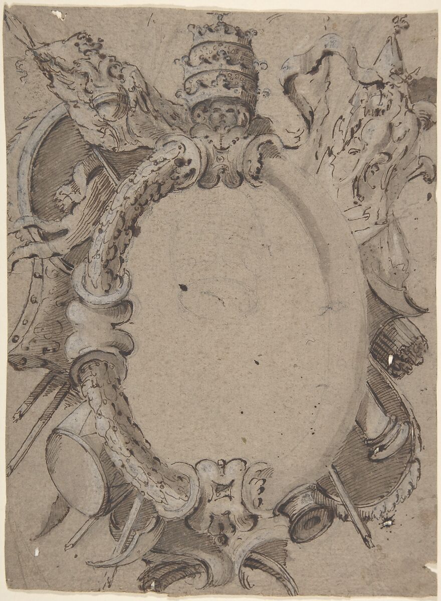 - Title: Design for Cartouche with Banners, Drums, Leaves and a Woman's Head with Tiara