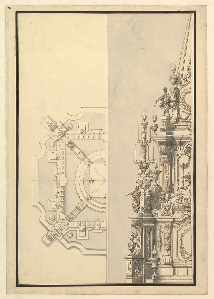 - Title: Half Plan and Half Elevation for a Catafalque for Margarita Louisa, Gran Duchess of Tuscany (d. 1721)