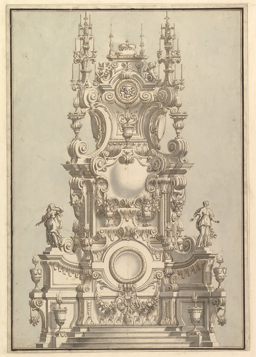 - Title: Elevation of a Catafalque, Surmounted by a Royal Crown, with Scull and Cross Bones in Wreath-Encircled Cartouche just below