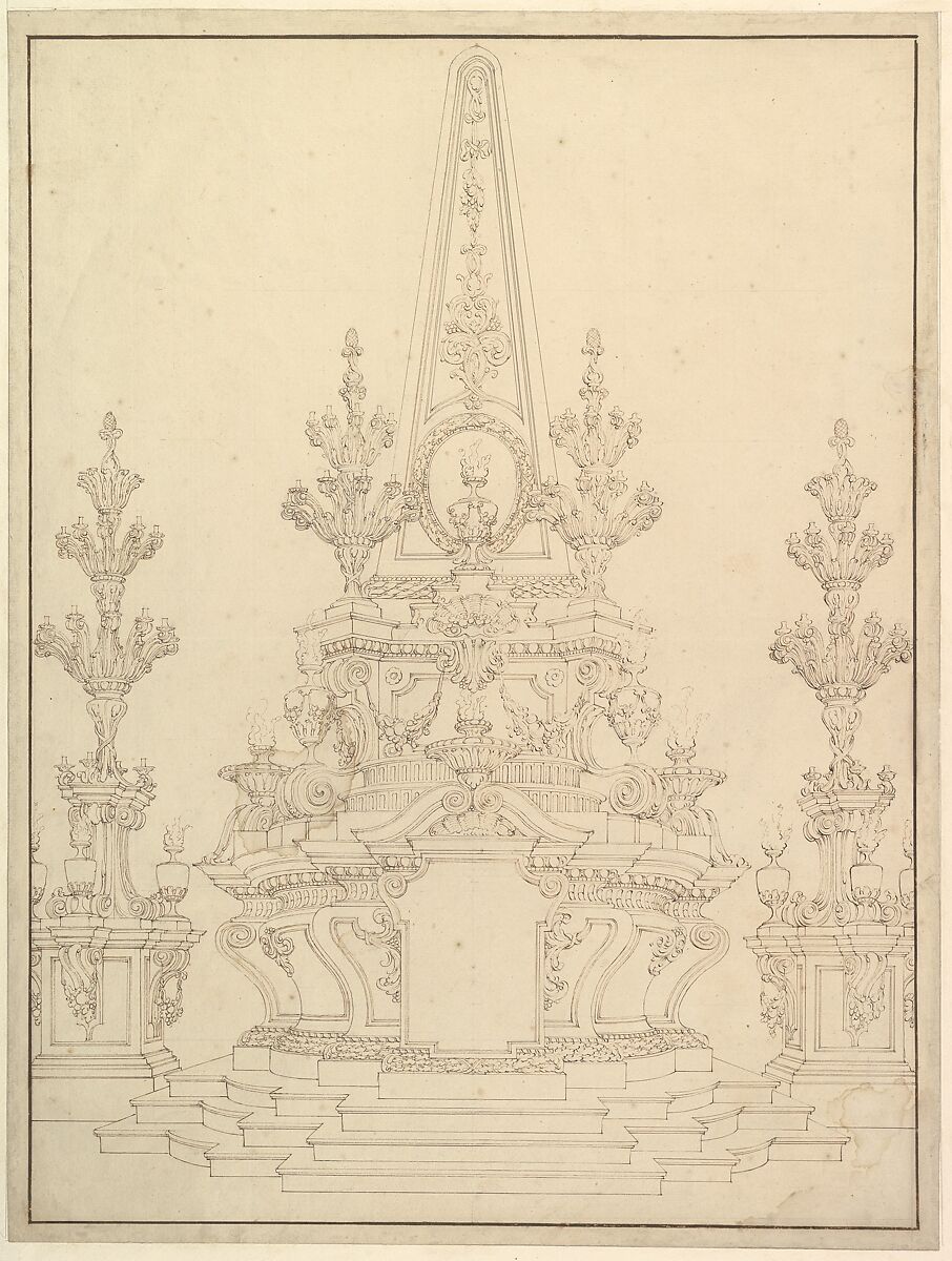 - Title: Elevation of a Catafalque: Two Pedestals with Candelabra at Sides; with Central Obelisk Surrounded by Candelabra (recto); Sketch of architecture: archway and corner with pillars (verso)
