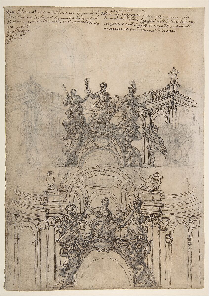 - Title: Studies for a Sculpture with Figures of Prudence, Industry and Economy Supported by Slaves and an Oval Plaque with Cartouche; Separate Study for a Cupola (recto); Studies for Figural Ornament (verso)