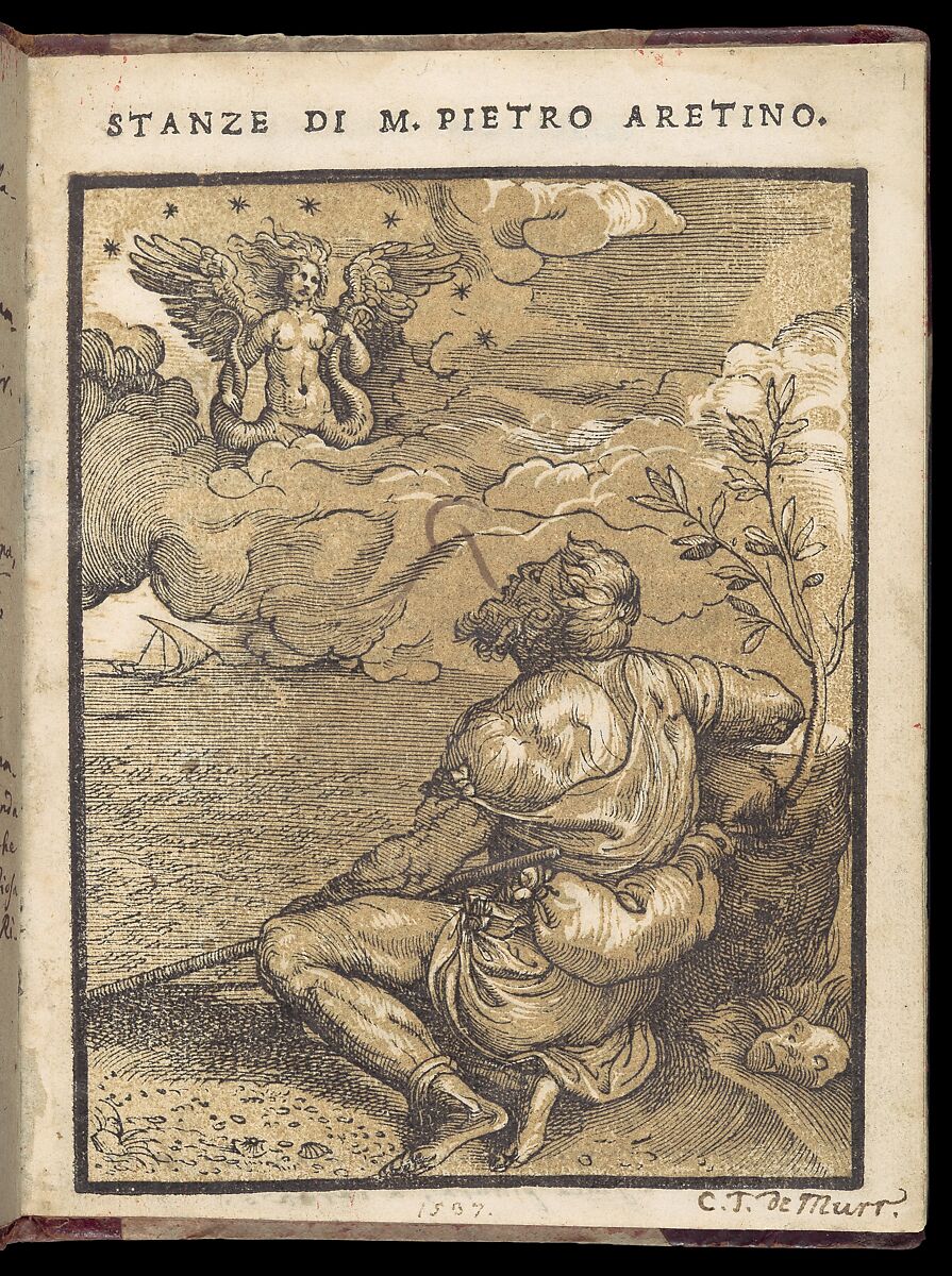 The woodcut perfectly illustrates the conceit of the poem, depicting the poet Aretino as a rustic shepherd, singing to his love, Angela Sirena, who appears as a winged siren in the heavens. These poems of praise were not well received by the husband and family of the woman Aretino admired. Her death in 1540 has been attributed to the troubles she experienced after being singled out in this way by the notorious Aretino.