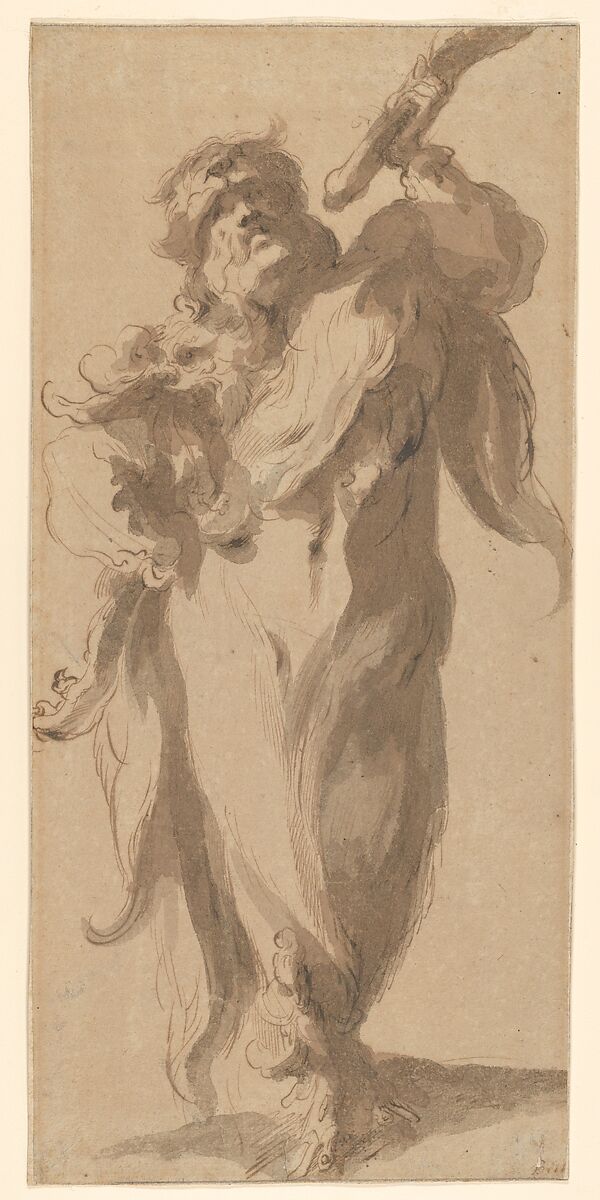 Few paintings survive by Jacques Bellange, a favored artist of the ducal court of Lorraine in what is today northeastern France. His reputation as one of the greatest late Mannerist artists is due primarily to his extant prints and drawings, which are distinguished by their idiosyncratic style combining courtly elegance and psychological expressiveness. This recently discovered sheet is entirely characteristic of Bellange's style as a draftsman. Flamboyant curves and curlicues are produced in a rapid ink line, delineating the figure's beard, the animal skins draped from his shoulder, and his elaborate sandals. Passages of parallel hatching, reinforced by blocky areas of wash, model his powerful, twisting form in a pose suggestive of both force and grace.