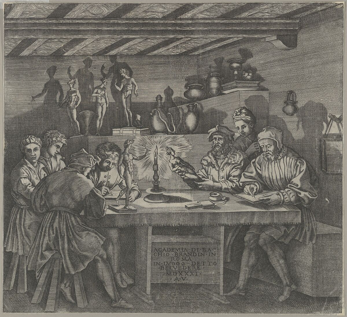 According to the inscription, this dramatic interior night scene depicts young art students at the Belvedere art academy in Rome. The school was run by the Florentine sculptor Baccio Bandinelli, famous for his drawings of the human figure. He is represented here wearing a fur-collared coat and holding a statuette of Venus. Before the founding of the first official art academy in 1563, artists traditionally received their training through apprenticeships in a master’s workshop like this one.