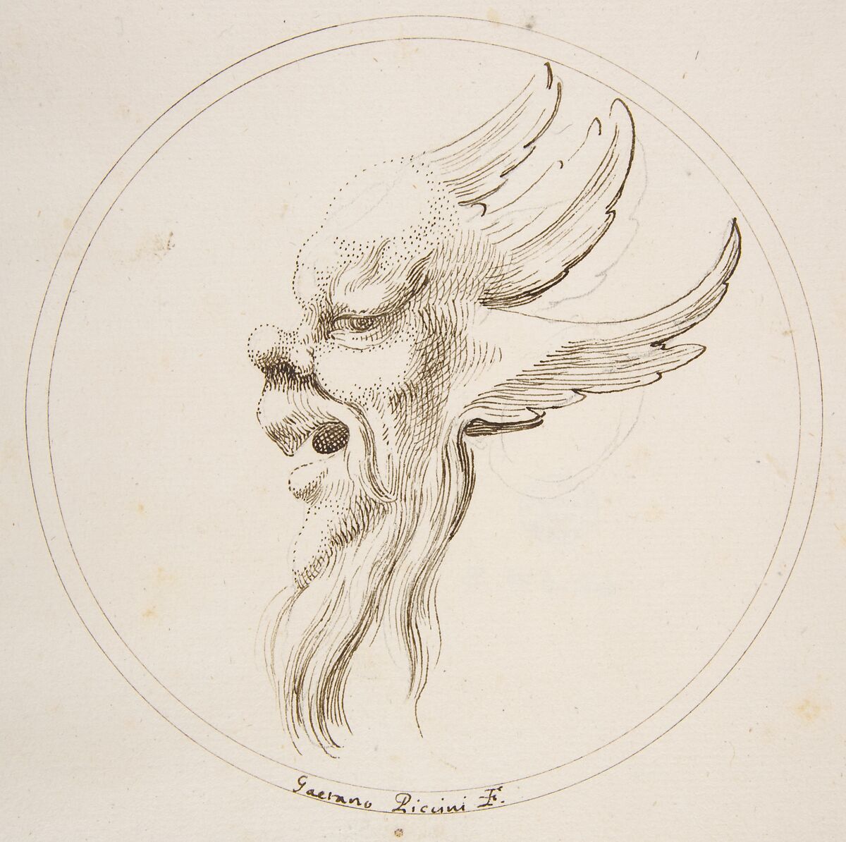 - Title: Grotesque Winged and Bearded Head Looking to the Left within a Circle