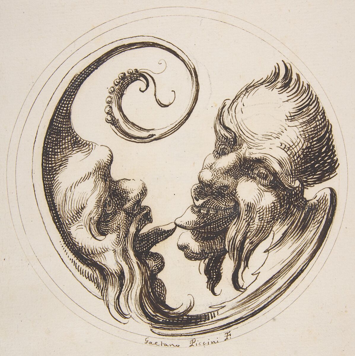 • Title: Two Grotesque Heads Facing One Another and Touching Tongues Within a Circle