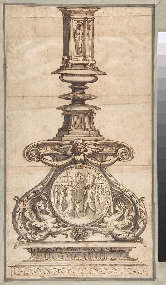 - Title: Design of a Candlestick with Winged Figures at Base Surrounding Scenic Medallion