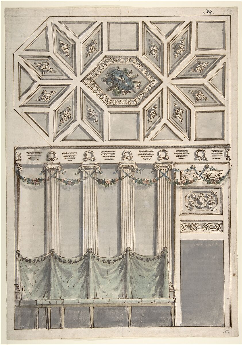 - Title: Framed Design for an Architectural Interior: Coffered Ceiling with Central Hexagonal Cartouche and Walls with Floral Ornament and Drapery.