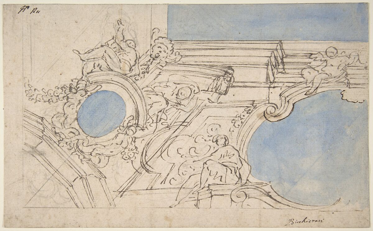 - Title: A Foreshortened View of a Ceiling Corner Decorated with Statues, Putti and Garlands