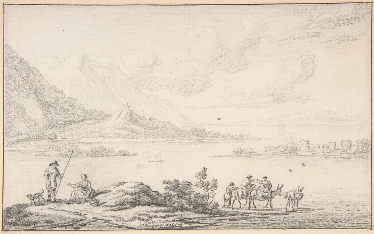 - Title: Landscape with mountains and a lake, figures in the foreground