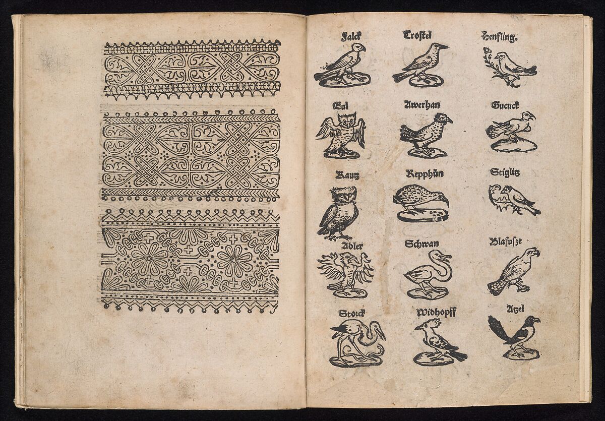 According to Lotz loc.cit. this book is made up of three Egenolff books. The title leaves 5 - 7 (sig. B i-iii) and the last two leaves belong together. Most of the patterns in sigs. a and c he thinks are from a still unknown edition of Egenolff's "Modelbuch welscher, ober.un niderlandicher Arbait", Lotz 15. One leaf is from Egenolff's later book (Lotz 20). MMA has photostat copy of undated second edition which must be after 1555, the year Egenolff died, since it is published by his heirs (Dick 934). Apparently unique. The title border is discussed in Lotz loc.cit. Biii outside border cut. see pl. 62 - fac. of Lotz 8 sig. in fac. on new marque. 14 leaves, unnumbered. Sigs: a - c 4, (d)2, (verso of title, blank). See notes in book tipped in at back.