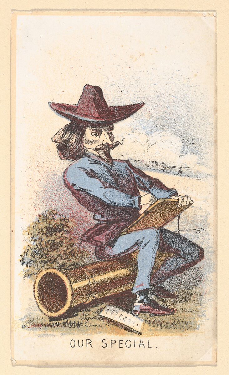 In 1864 Homer designed two series of lithographed collectors’ cards titled Life in Camp for the Boston publisher Louis Prang & Co. Unlike his serious war-time images for Harper’s Weekly, the artist felt free to inject humor into these miniature comments on army life which include images of wives and sweethearts and soldiers enjoying themselves on leave. Several Zouaves are depicted, members of Union volunteer regiments whose colorful North-African inspired uniforms were distinguished by baggy trousers, a short jackets and tasseled caps. Homer even caricatured himself in a card titled Our Special. By 1864 the war was entering its final months and formerly sacrosanct subjects could be approached more lightly.