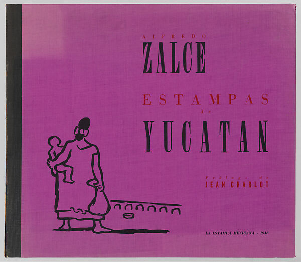 A Prologue written by Jean Charlot in both Spanish and English describes the beauty of the prints and Zalce’s unique way of creating them: by scraping ink off a blackened lithographic stone to reveal the light areas. The bilingual text testifies to the aspiration that the portfolio would appeal to an international audience. All eight lithographs are signed and dated (1945) by Zalce and they were printed by José Sánchez in the workshop of the Taller de Grafica Popular (Fine Arts division). The edition was limited to 100 copies. The number of this copy is not recorded in the space provided for this information on the inside cover. The prints are housed in the original purple buckram casing with the letterpress Prologue forming the first sheet.