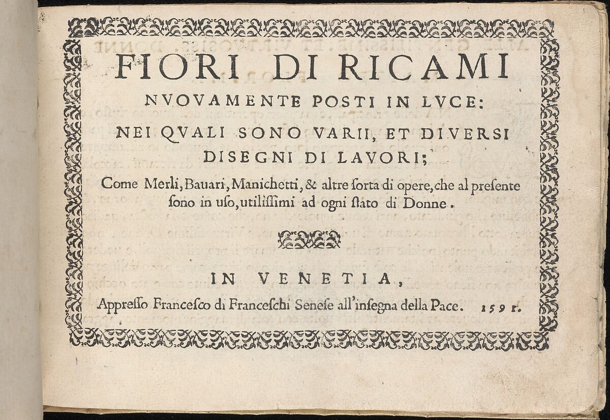 Title page with foliage-patterned border, dedication on verso of title page with woodcut initial letter, 17 pages of designs. Many designs are the same as those printed in the 1591 Ciotti pattern book.