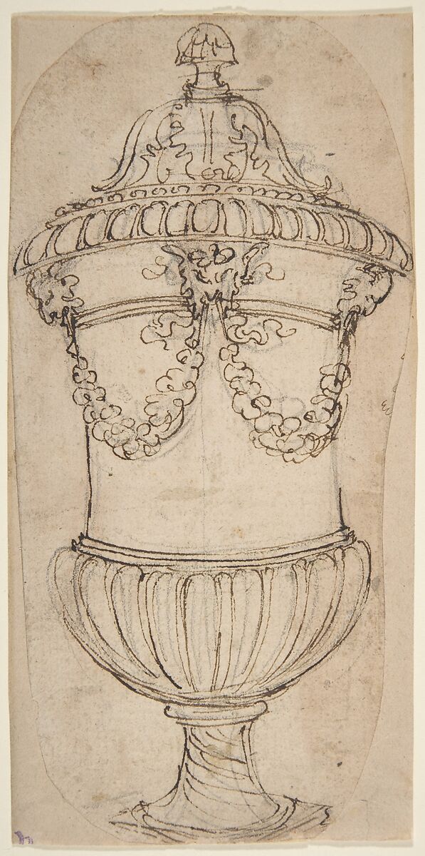 - Title: Design for a Lidded Gadrooned Vase with Satyr Heads Holding Garlands