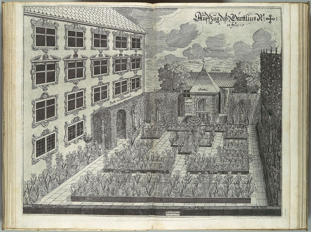 Furttenbach's intimate garden courtyard with a small grotto, richly decorated with rare flowers arranged in several compartments, illustrates the intimate "secret garden" owned by the wealthy bourgeoisie in early seventeenth-century Germany and the Netherlands. Furttenbach describes the grotto in his garden as being filled with artifice and exotica, including shell-encrusted sculptures and waterworks, painted cosmological imagery, and mirrors. His garden is a kind of open-air museum where the plants constitute the valued, living statues. The flowers are identifiable as the most sought after and costly bulbs of the period, the narcissus, tulip, fritillary, and crown imperial, demonstrating Furttenbach's knowledge of current botanical research.
